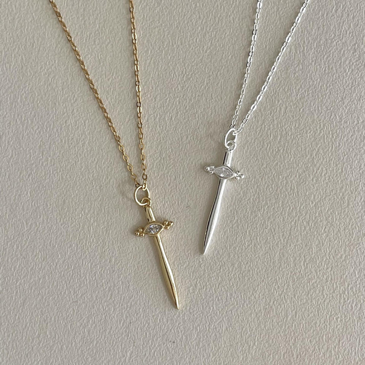 Diese außergewöhnliche Halskette vereint die Symbolkraft von Kreuz und Schwert in einem stilvollen Design. Der Anhänger ist mit einem funkelnden Zirkonia-Stein verziert, der dem Schmuckstück eine elegante Strahlkraft verleiht.